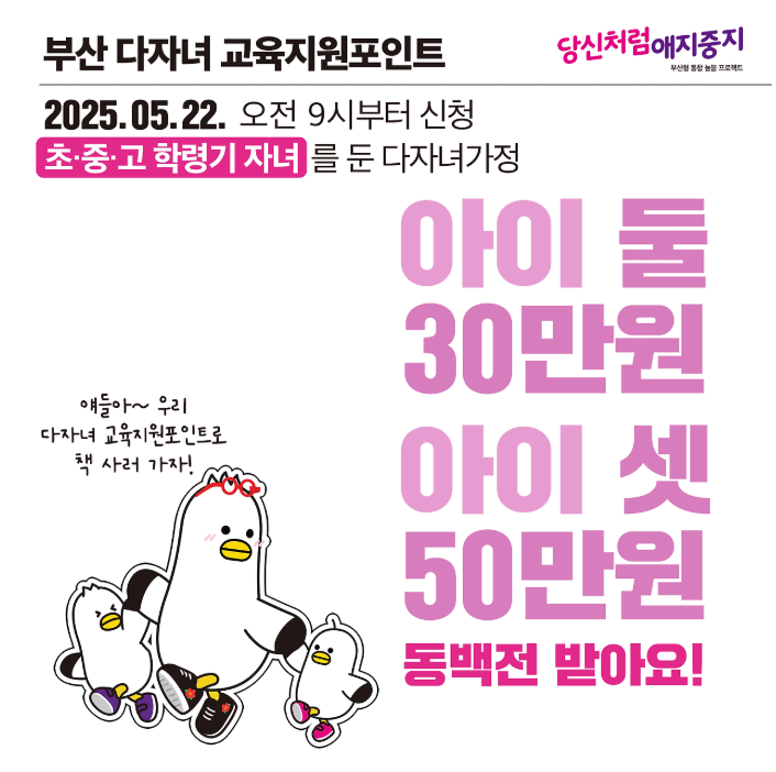 다자녀라서 행복하지만 교육비는 늘 걱정이신가요? 부산시는 다자녀 가정의 교육비 부담을 덜어드리기 위해 다자녀 교육지원 포인트를 지원하고 있습니다. 학원비, 교재비, 문구류 등 자녀가 많을수록 들어가는 비용이 많아 고민이셨다면, 이 제도가 큰 도움이 될 수 있습니다. 놓치지 말고 신청하여 최대 50만원 받아가시기 바랍니다.