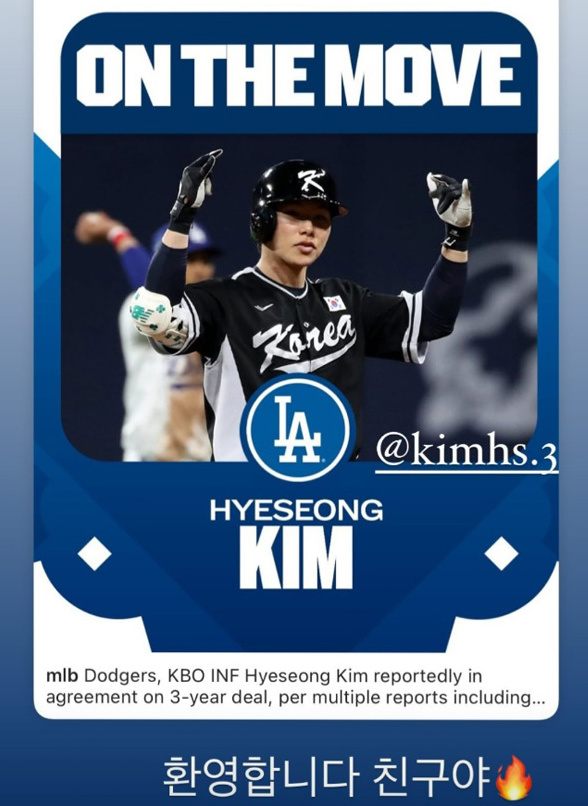 김혜성의 다저스 합류가 확정되었을 때, 오타니는 자신의 SNS에 김혜성의 사진과 함께 "환영합니야 친구야"라는 한국어 메시지를 게시하며 환영의 뜻을 전했습니다.