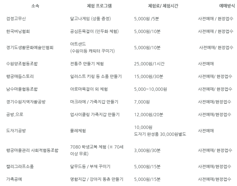 수원국가유산야행에는 여러가지 다양하고 재미있는 이벤트들이 준비되어 있습니다. 수원국가유산야행에서 쉽게 접해볼 수 없었던 이색적인 체험을 경험해보시기 바랍니다. 인기있는 체험의 경우 예매가 조기마감 되니 미리 사전예약하시어 잊지못할 추억을 만드시기 바랍니다.
